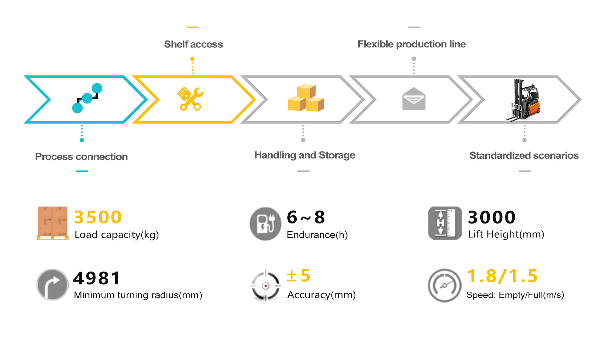 Integrated with 3D vision, LiDAR and mechanical anti-collision devices, the detection range is 0-3m, supporting active avoidance and emergency stop in human-machine mixed environments.
