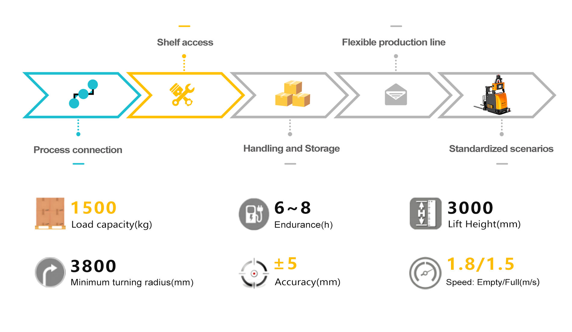 The second phase project adopts multiple balance weight forklift AGVs to complete unmanned handling of multiple floors on the first floor. Through a closed-loop system, real-time uploading of product inventory status, outbound information, equipment status, etc. is achieved to create visual management of information flow.