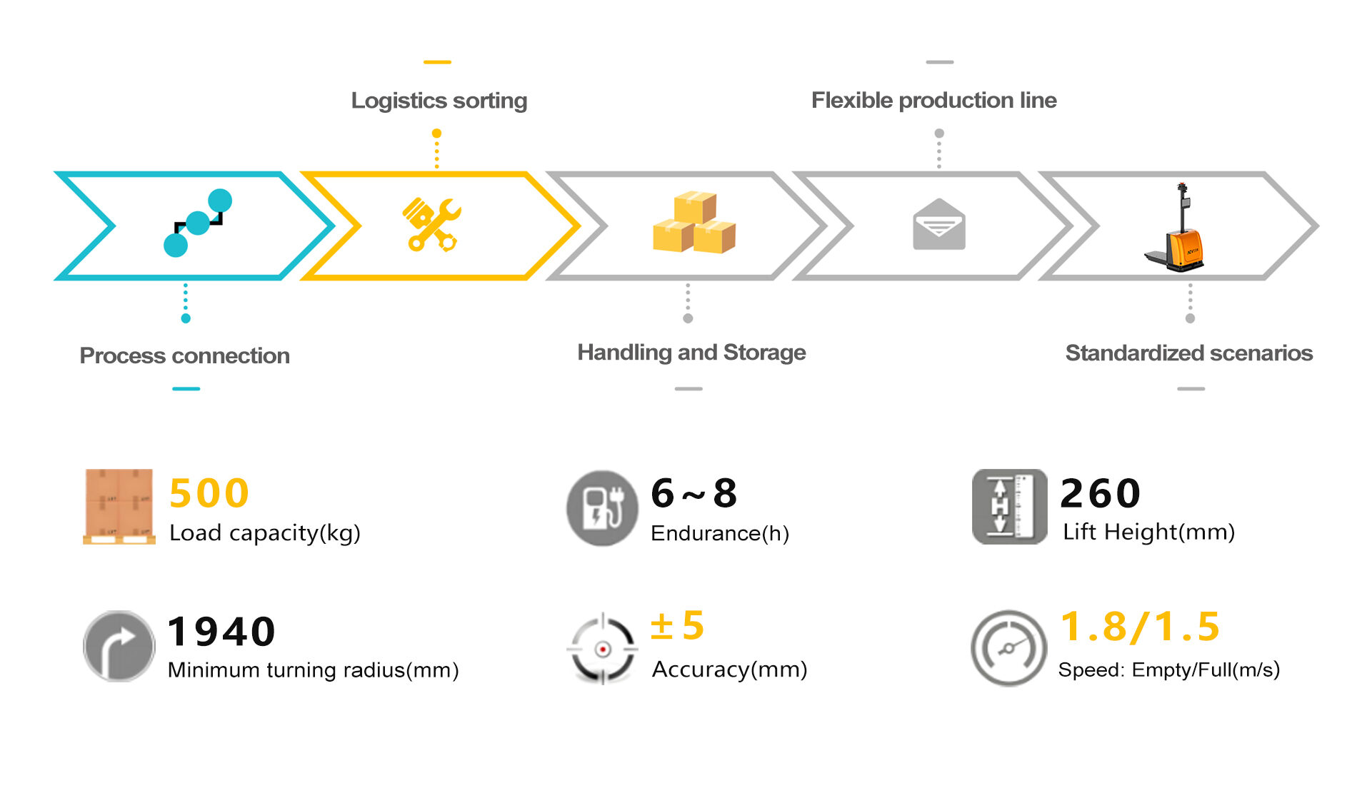 Small size and heavy load, flexible operation in narrow spaces, switching between automatic navigation and manual control modes.